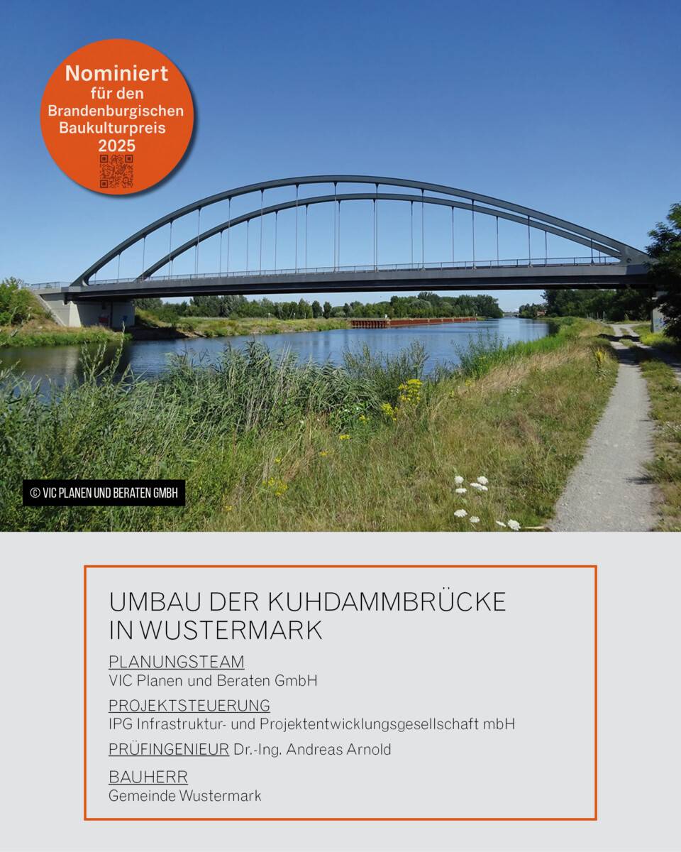 Das Projekt Umbau der Kuhdammbrücke in Wustermark, bei dem die IPG die Projektsteuerung im Auftrag der Gemeinde Wustermark übernommen hatte, zählt – aus insgesamt 74 Einreichungen ausgewählt – zu den 8 Nominierungen für den Brandenburgischen Baukulturpreis 2025.